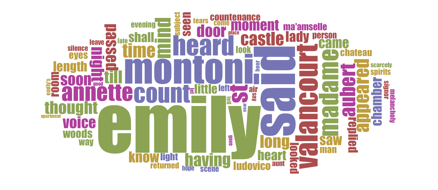 The image below is a word cloud showing the 75 most frequent words in Udolpho, excluding a standard list of stop-words such as pronouns, conjunctions, articles, and other common words (Sinclair). The word veil does not appear in this word cloud. In fact, it appears only 47 times in the text of 290 801 words, according to Voyant, the web-based text analysis tool I used to create this word cloud. Clearly, the frequency of the word in no way reflects the thematic or literary significance of the veil in the novel, a problem for those of us interested in using computation to explore thematic questions (at least those of us with novice-level text analysis skills).